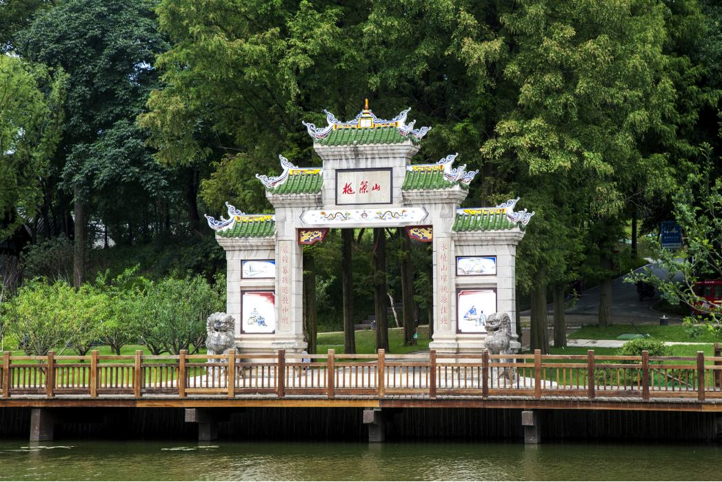 為桃源山景區(qū)入口標(biāo)志,四柱三級(jí)五樓的磚混結(jié)構(gòu)仿古建筑。主樓門牌上有著名相聲大師馬季先生所書“桃源山”三個(gè)大字,大門兩側(cè)有“漁村夕照”、“后門洞”、“問津處”、“纜船洲”等桃源山景點(diǎn)的山水畫,背面有反映桃源山道教傳說的人物畫。