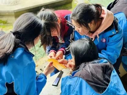 在研學游過程中,學生們不但參觀了桃花源最古老的建筑方竹亭,標志性建筑桃花山牌坊以及桃花觀、菊圃、遇仙橋等,還通過對古建筑群的考察,實地測量繪制園林造圖,進一步領悟和感受了園林建筑結構之美。